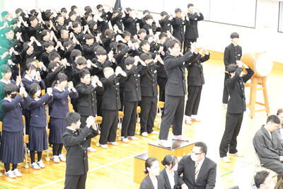 1月30日(金)卒業を迎える3年生へのありがとうの会が実施されました。1,2年の在校生からは様々な出し物を通して感謝の気持ちを伝えました。今年から始める創作鬼剣舞も,後輩たちによって披露されました。後期生徒会執行部になって初めての大きな行事となりました。